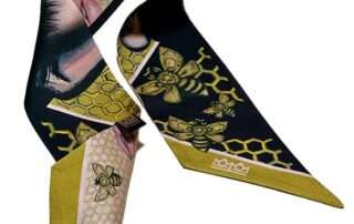 •CharmTwist Queen Bee – A slender 7×90 cm scarf inspired by my painting Queen Bee. With its striking gold and black tones, this design embodies power and grace, making it perfect for adding a regal touch to any outfit.
